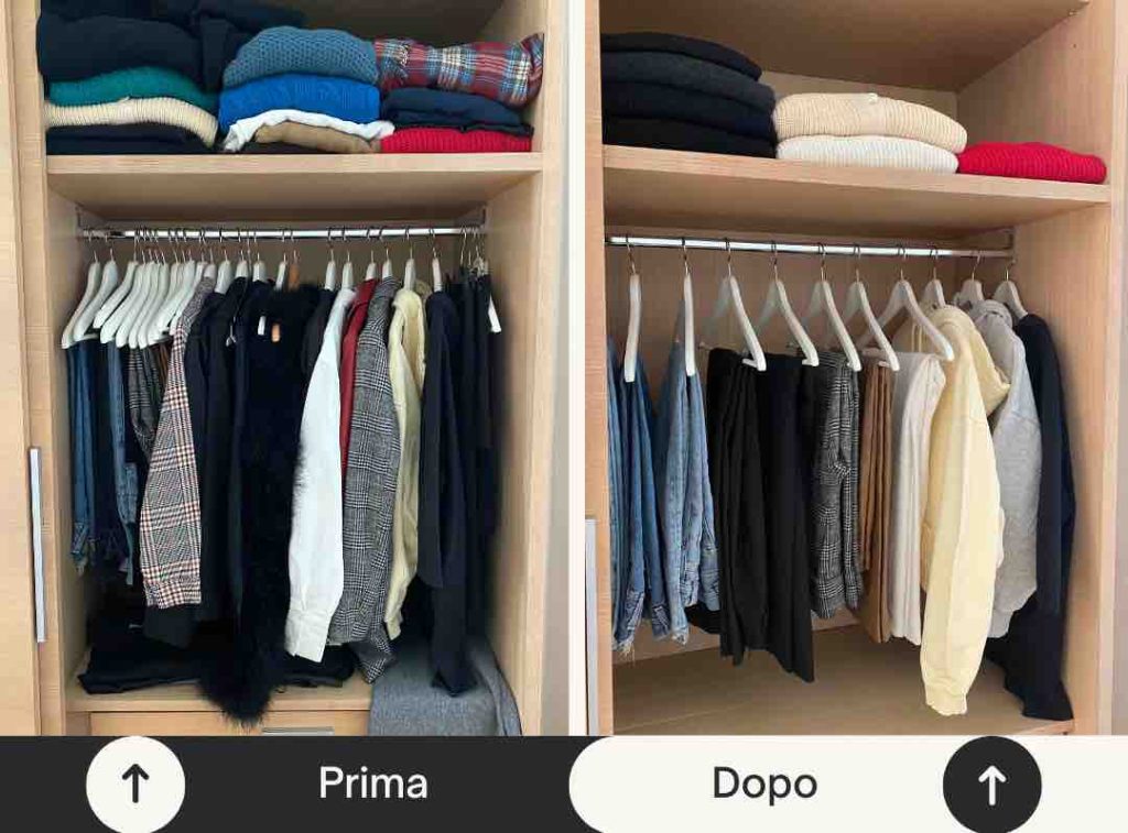 Eccovi un prima e dopo la mia ultima sessione di Decluttering del Armadio. Avevo molte cose che occupavano spazio e che non usavo più. Riuscite a percepire la sensazione di libertà?